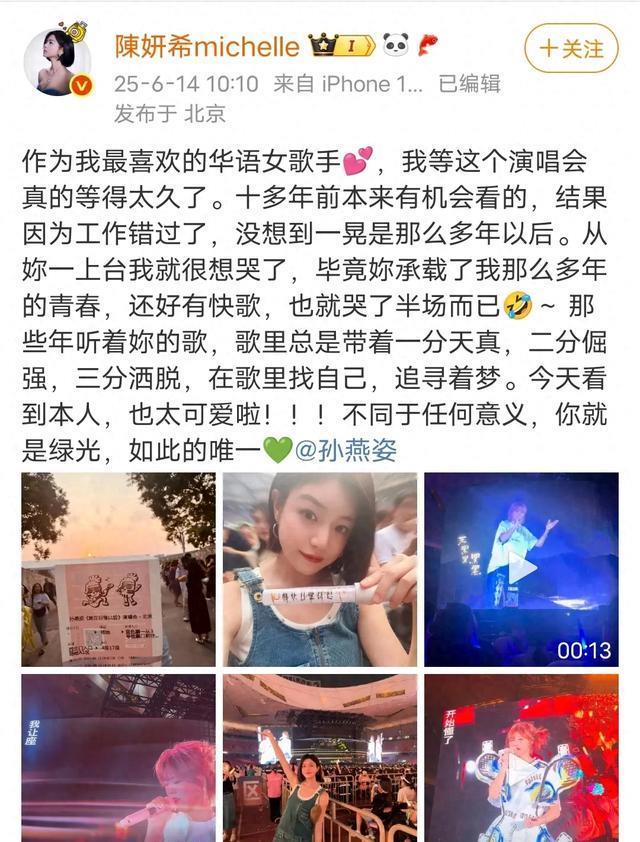 6月14日,演员陈妍希又又又去看演唱会了。只不过这次不是和闺蜜、好友,而是她一个人独自去追了一回自己最喜欢的华语女歌手——孙燕姿。